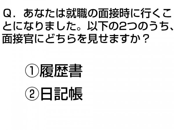 これは、就職面接等、自分を売り込むときに、「履歴書」を持っていくか、「日記帳」を持っていくかという簡単なクイズです。