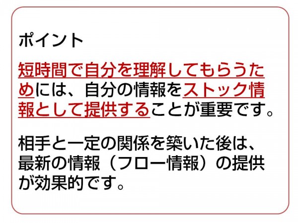 ・短時間で自分を理解してもらうためには、自分の情報をストック情報として提供することが重要です。