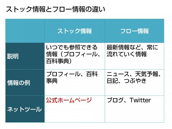 インターネットでいえば、ストック情報を重視したものが公式ホームページ、フロー情報を重視したものがブログやTwitterになります。
